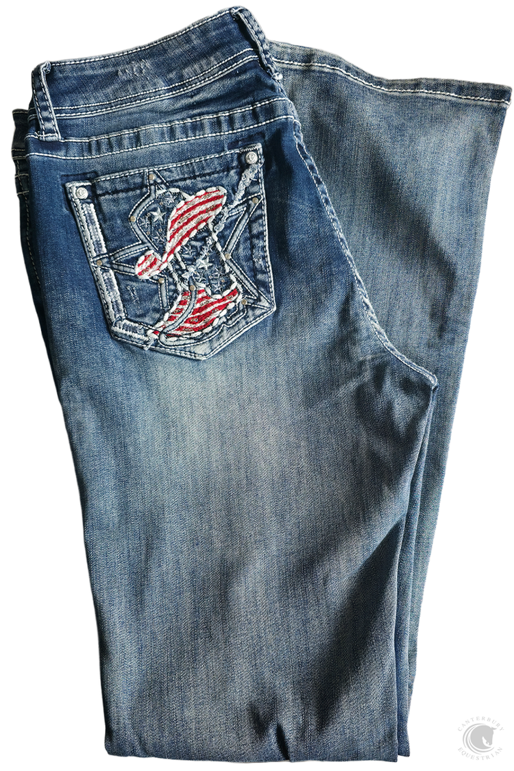 The Grace in LA women's bootcut jean in Easy Fit shows off your best shape by featuring a higher rise. The denim fabric features a softer and higher stretch for exceptional comfort all while maintaining a denim look. The mid-rise creates a form-flattering fit for every curve. The jean is detailed with a western  embellished and embroidered design on the  back pockets, added embellishment on the front pockets, natural hand-sanding, and whiskering. They look like they’ve been yours forever.