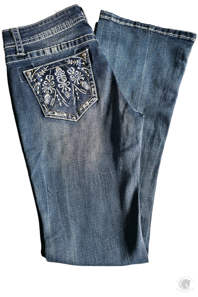 The Grace in LA women's bootcut jean in Easy Fit shows off your best shape by featuring a higher rise. The denim fabric features a softer and higher stretch for exceptional comfort all while maintaining a denim look. The mid-rise creates a form-flattering fit for every curve. The jean is detailed in a western embroidered design on the back pockets with crystal embellishment, added embellishment on the front pockets, natural hand-sanding, and whiskering. They look like they've been yours forever.