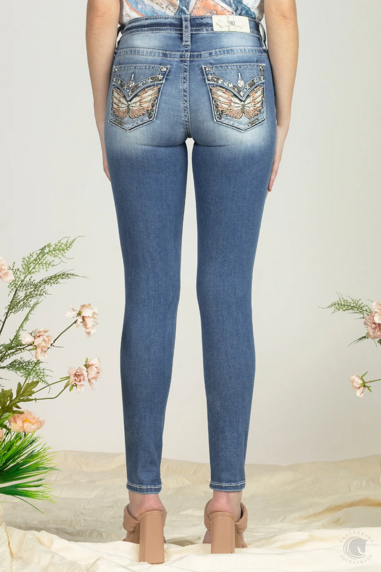 Mid-rise, light wash skinny jeans. Back pocket features embroidered wings with leather patch details, multicolor sequin and stud detailing. Flap features border stitch with sequin, stitching, and stud detailing. White leather patch with embossed cross design and M logo.