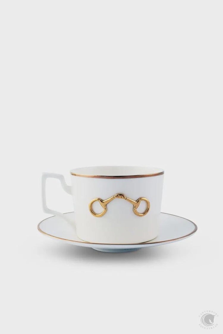 Savor tea time with this exquisite white bone china cup and saucer set. Finely appointed with a gleaming gold rim and snaffle bit, this pairing is all at once classic and modern.