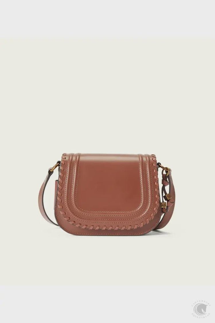 The Nomad Saddle Bag in full-grain leather combines elegance and utility, featuring suede lining, whip stitch details, adjustable crossbody strap, and dual compartments, finished with R.M.Williams debossed script logo.