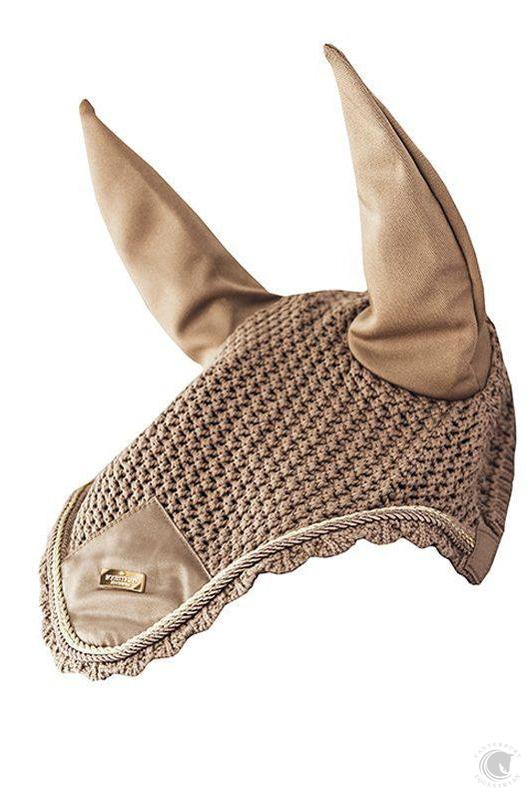 Luxurious ear net in champagne with piping and metal badge in gold. Perfectly matched with saddle pad ‘Champagne’.