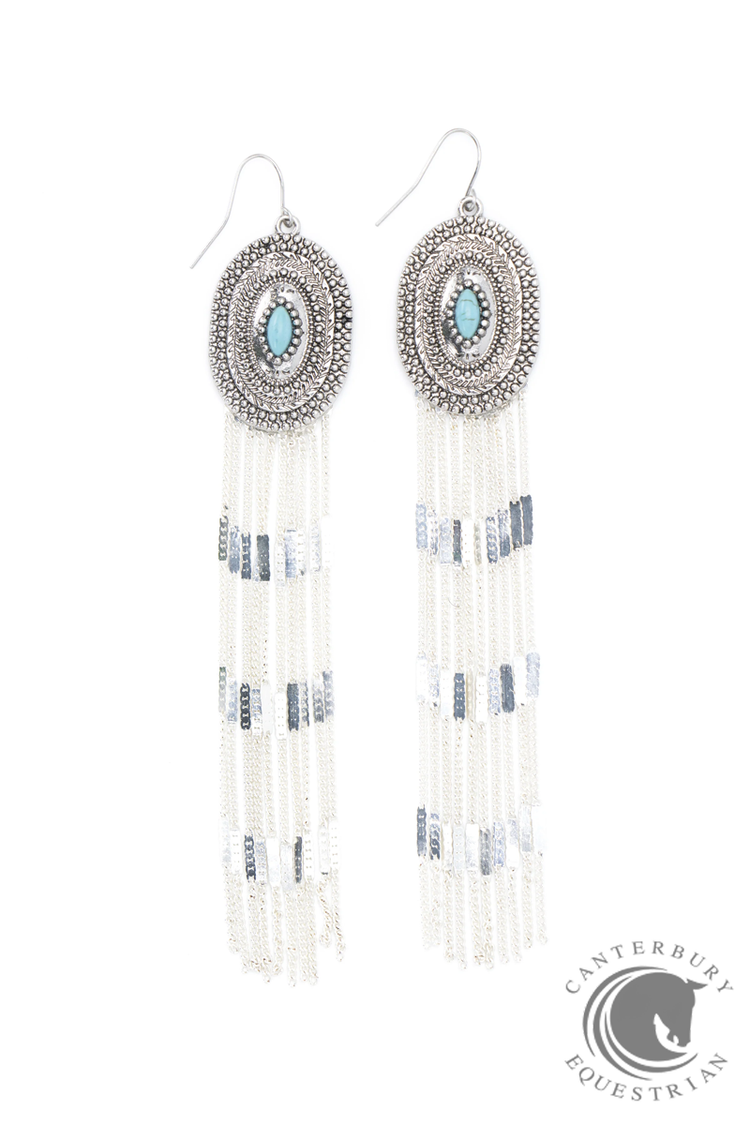 • Inlaid turquoise center stone with cascading liquid silver chain