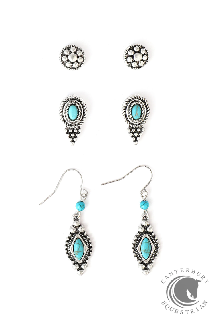 • Diamond shaped dangle earrings accented with small oval howlite turquoise center stones and etched detail