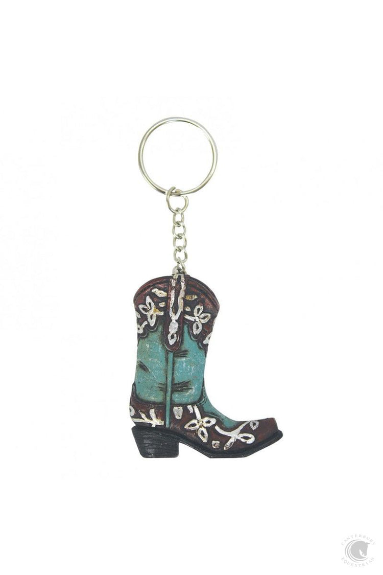 Keychain in the shape of a cowboy boot with turqouise detailing.