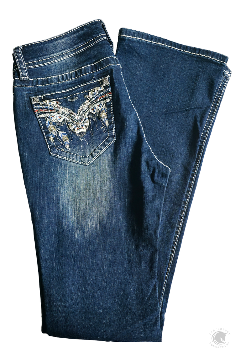 The Grace in LA women's bootcut jean in Easy Fit shows off your best shape by featuring a higher rise. The denim fabric features a softer and higher stretch for exceptional comfort all while maintaining a denim look. The mid-rise creates a form-flattering fit for every curve. The jean is detailed with a western embellished and embroidered design on the back pockets, added embellishment on the front pockets, natural hand-sanding, and whiskering. They look like they’ve been yours forever.
