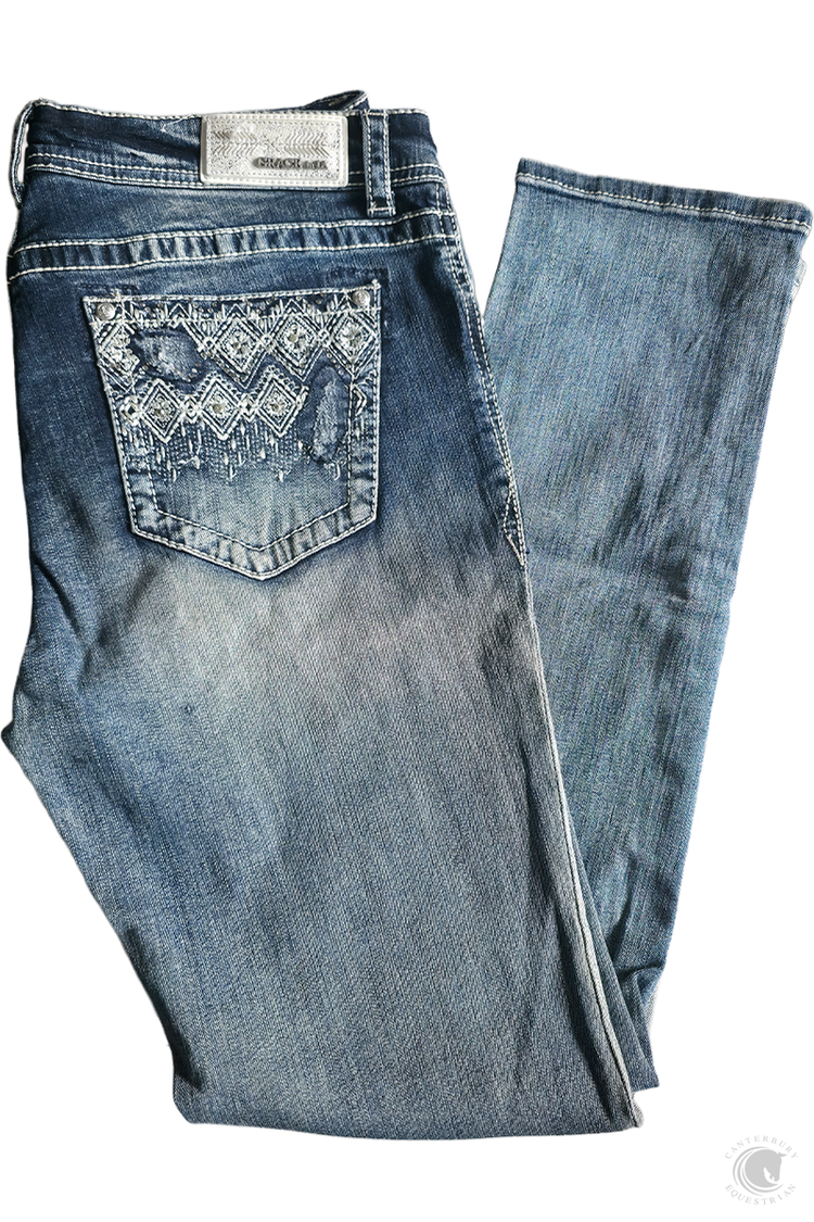 The Grace in LA women's bootcut jean in Easy Fit shows off your best shape by featuring a higher rise. The denim fabric features a softer and higher stretch for exceptional comfort all while maintaining a denim look. The mid-rise creates a form-flattering fit for every curve. The jean is detailed with a western embellished and embroidered design on the back pockets, added embellishment on the front pockets, natural hand-sanding, and whiskering. They look like they’ve been yours forever.