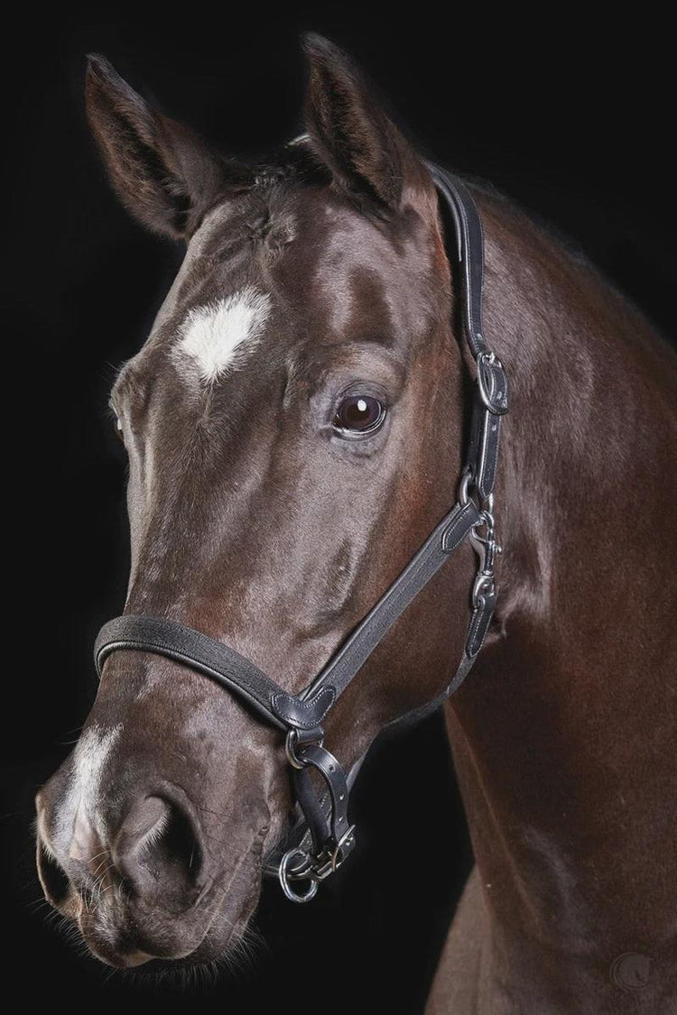CRAFTED FROM A QUALITY LEATHER, IT HAS AN ANATOMICALLY DESIGNED HEADPIECE WHICH EVENLY DISTRIBUTES PRESSURE ACROSS THE POLL FOR COMFORT.