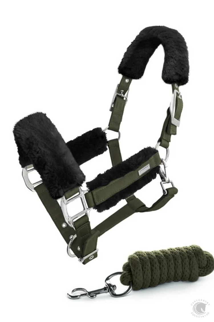 Keep it cozy with this exclusive halter with soft teddy fur. Designed in an elegant dark green paired with black teddy fur and silver buckles. Decorated with the stylish silver ES badge. Style with other pieces from the same collection for a complete look.