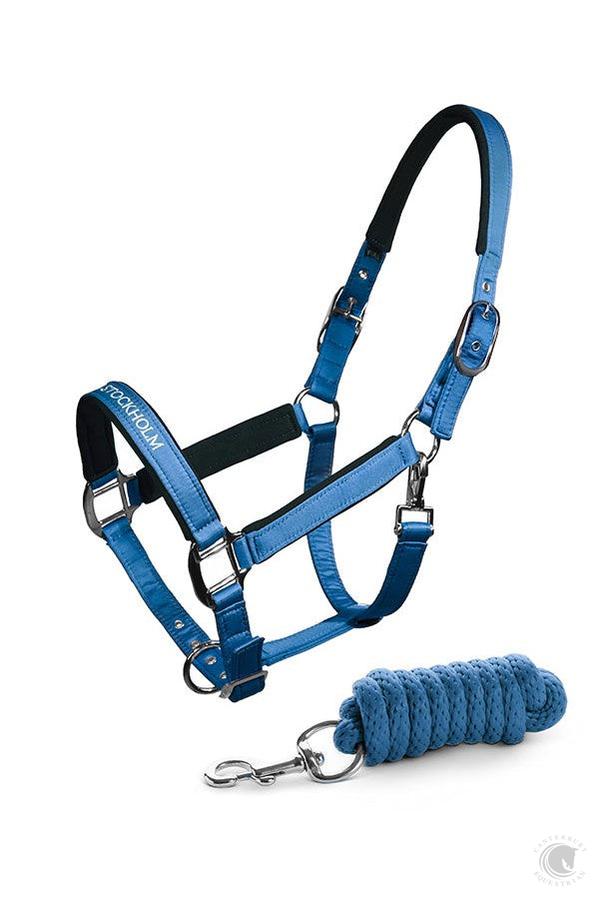Keep it trendy with this exclusive halter in beautiful blue color styled with silver shiny buckles and combined with black fleece padding. Embellished Equestrian Stockholm logo on the noseband. Style with other pieces from the Amalfi collection for a complete look.
