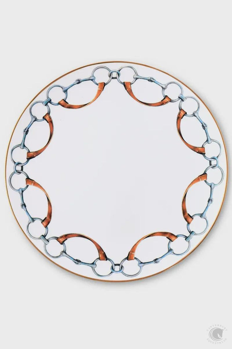 The Wellington Bit collection is a sleek twist on the iconic equestrian snaffle bit theme, taking it a step further into a striking Bone China dinnerware collection of polished sophistication. Whether tail-gaiting at the polo field or setting an elegant table for a formal dinner party, Vagabond House presents a statement of classic high style and is sure to garner attention and admiration. Fine Bone China was designed and hand-drawn by Vagabond House’s master artist Leesa Greenlee. Shiny Gold rimmed add a formal class and style to the 12 inch Charger.