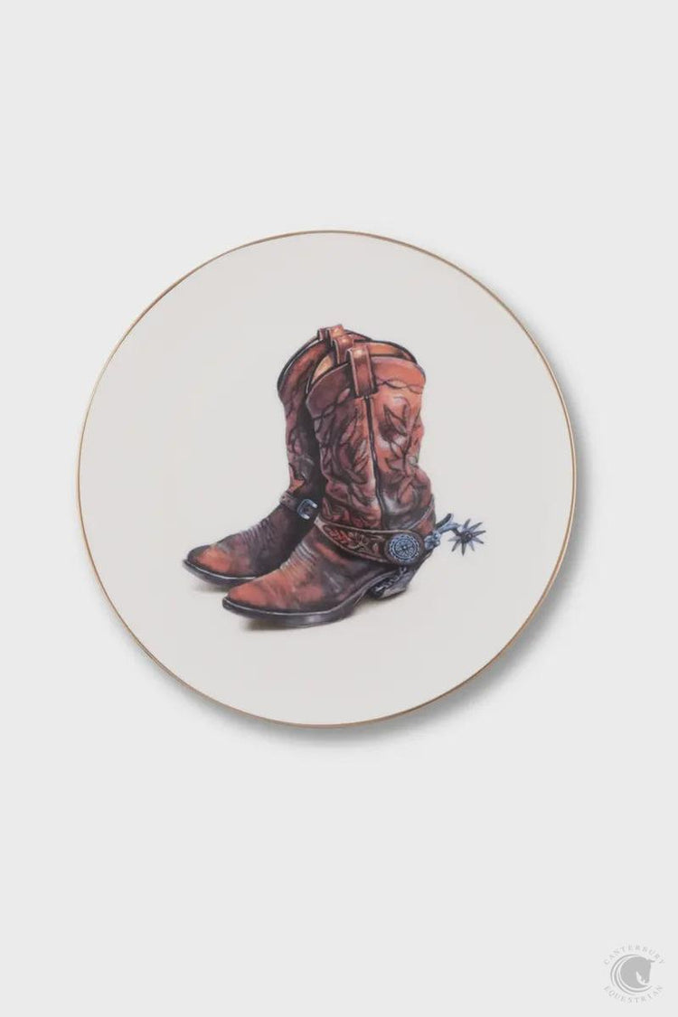 Top your place setting in western style with a portrait of a well worn and much loved pair of cowboy boots. The art on our round salad plate is drawn, painted and designed by master artist Leesa Greenlee. The boots look so real you can almost feel the buttery leather. A finishing touch of a shiny gold band at the plate rim helps create an ambiance of adventure and comfort for all to relax and enjoy a delicious repast together.