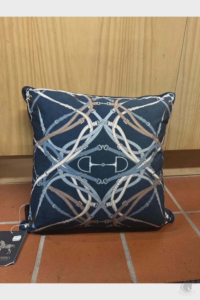 BIT AND STRAPPING CUSHION NAVY/CREAM 2 SIDES.  Amazing luxury velvet cushion, down filled. Beautiful gift for a horse lover!