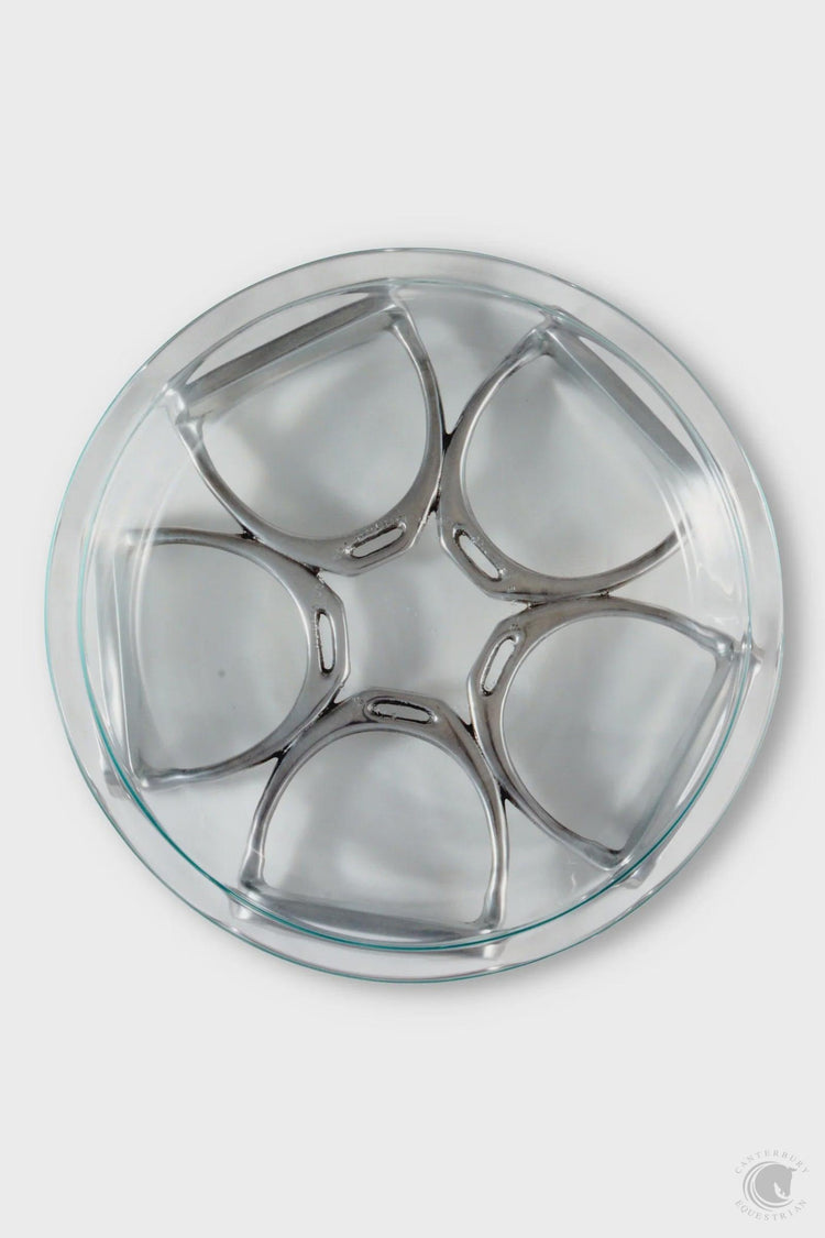 A completely unique Equestrian serve and décor piece, you will only find the Arthur Court Stirrup Trivet and Pie plate here. A ring of 5, true to life detailed, connected stirrup irons, hand-crafted in Arthur Court’s luxury grade proprietary aluminum alloy. The irons support an included clear glass pie plate.