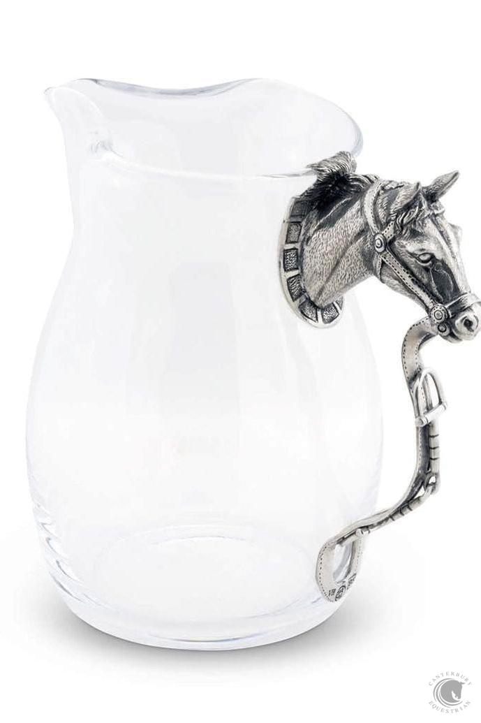 A thoroughbred’s head extends horizontally from the glass as its intricate mane wraps around the pitcher’s rim. A thick, figural strap attaches under the horse’s muzzle before winding towards the base to complete the handle. The pure-pewter design displays incredible realism in its exquisite form.