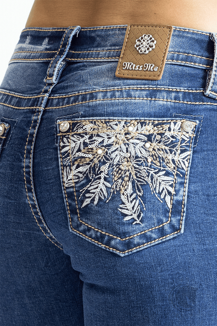 - Embossed brown quilted leather brand patch with metallic silver Miss Me hardware