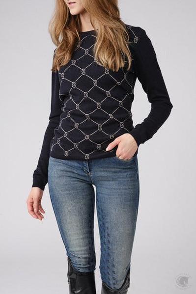 PS of Sweden Linnea Knitted Sweatshirt -in Classic Navy, A beautiful quality fine knit sweatshirt made in RWS merino wool blend. Fine knit sweater made in responsibly produced merino wool. Jacquard-knitted PS logo pattern in contrasting colour at front. Comfortable slim fit, with rib-knitted round neck and matching hem and cuffs.