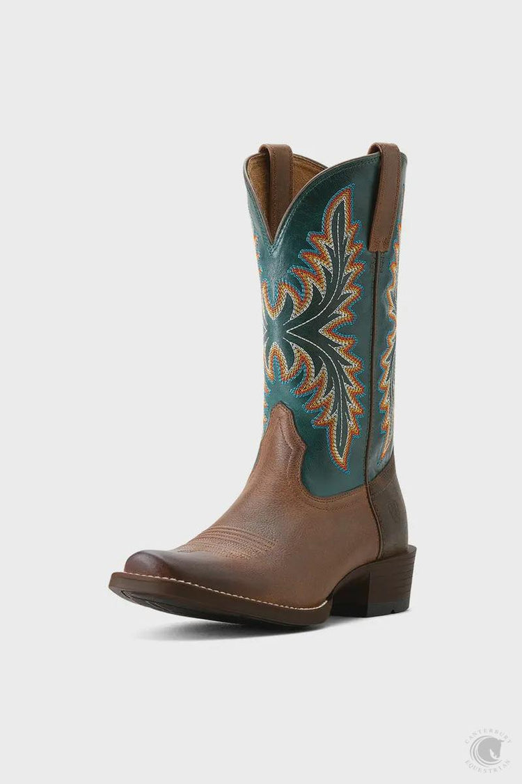 This ultra-lightweight boot packs a style punch. With a narrow cutter-toe silhouette and a bold shaft design, it's a head-turner in and out of the arena. Features ATS® technology provides ergonomic support on uneven terrain Removable All Day Cushioning insole, Bantamweight™ sole is lightweight and flexible, Eight-row stitch pattern, Ariat is including you in its dedication to environmental stewardship. By purchasing this product, you are supporting the responsible production of leather at Leather Working Group-certified tanneries. Size & Fit 12" height Futurity heel 1.75" heel height Narrow cutter toe Materials Full-grain leather foot and upper Synthetic lining