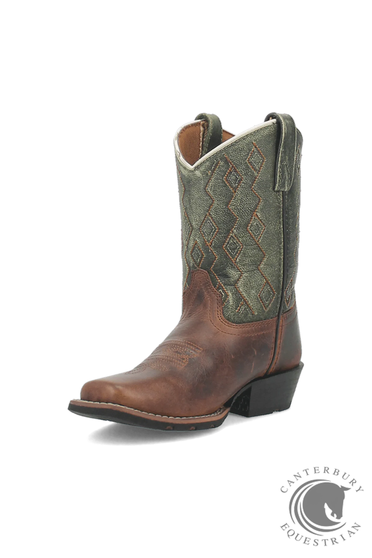 Your little man will love this stylish Teddy boot. Constructed with genuine leather. The green shaft is distressed and stitched with a unique diamond pattern. It's paired with a rust leather foot, and has a Comfort Cushion insole, broad square toe, and rubber outsole.