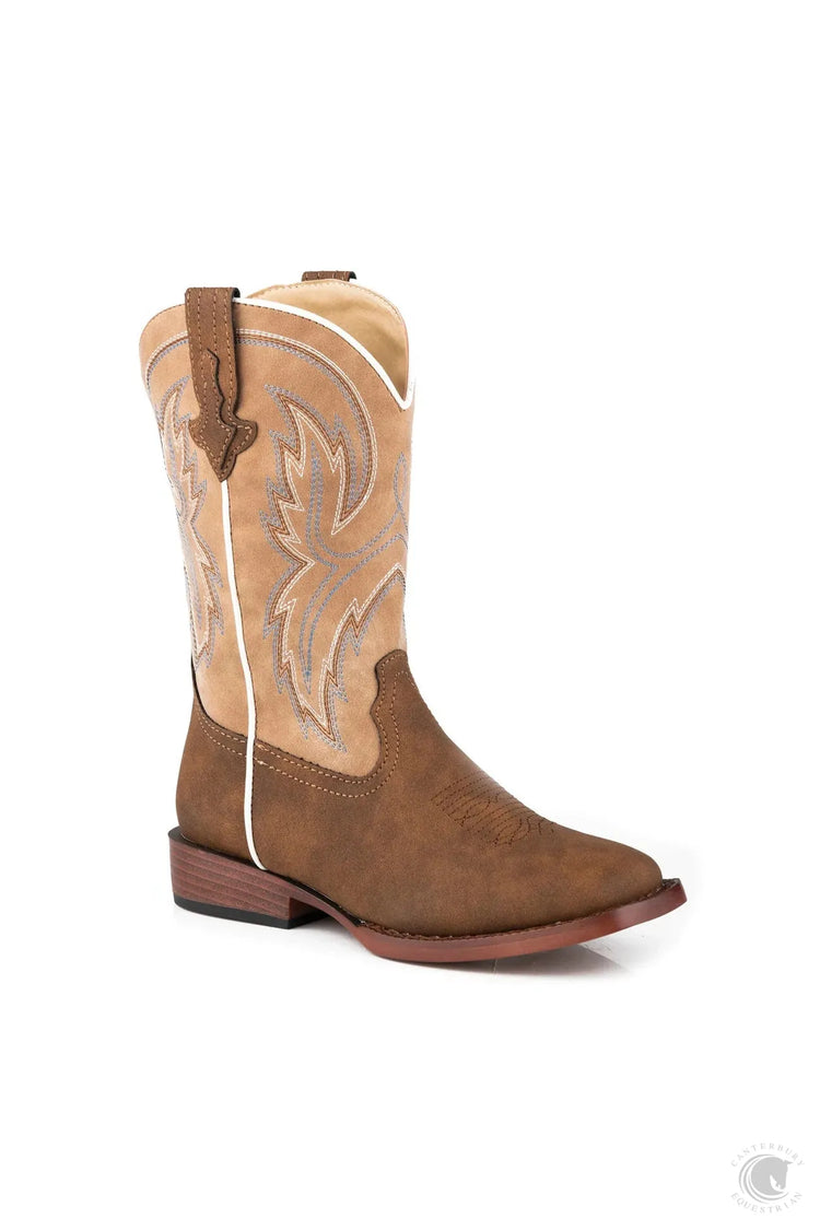 Brown Faux Leather Vamp With Tan Shaft Western Stitch Design On Shaft Overlay Mule Ear Pull Flexible Bottom Square Toe Padded Cushioned Insole Flexible TPR Sole 9 Inch Shaft Fabric Lining 1 Inch Heel