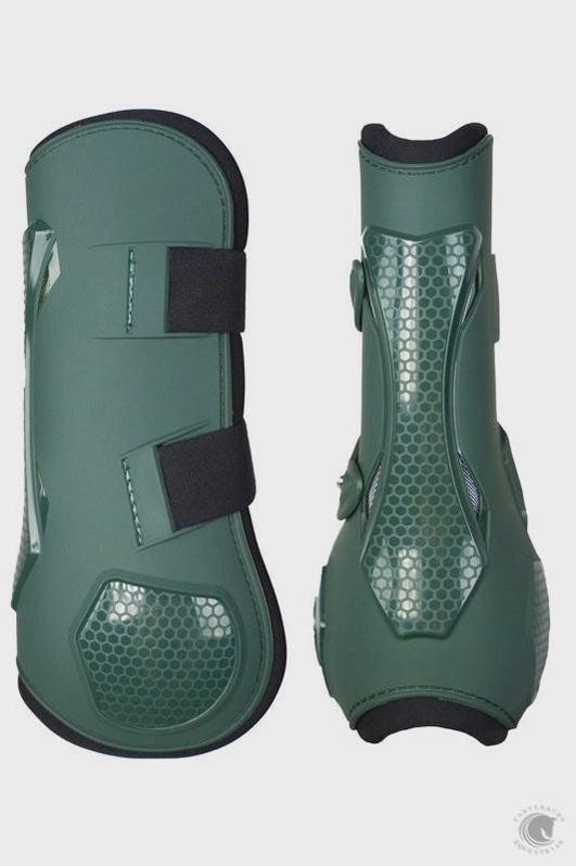 Our lightweight Anatomic Tendon Boots (FEI approved) are developed to protect horses while jumping, they help reduce impact on the front legs and at the same time support the tendon. Designed in cool dark green color with black lining. They are manufactured with a thermoplastic polyurethane (TPU) shell which make the boots water resistant. They have a breathable neoprene foam lining with ventilation holes to keep the tendon from overheating during longer jumping sessions. The boots are enhanced with a hard shell at the center of the back to protect the tendon from impact. Easy to put on and remove with quick release ends. The boots have 3cm wide elastic straps with fixed positions that prevent the straps from being tightened too hard. With these elastic bands you can be sure they will stay in place. Match with the Anatomic Fetlock Boots from Sycamore Green collection for a complete look.