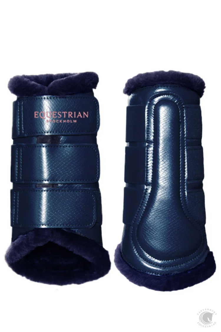 High quality brushing boots with all-round fit, designed in a beautiful navy paired with rose gold details. Produced in shiny synthetic leather with croco imitation. Soft teddy on the inside against the horse’s leg. Elastic Velcro closings with the stylish Equestrian Stockholm logo. Style it with other products from the same collection for a complete look. The boots comes in pairs of two.