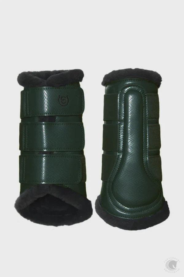 High quality brushing boots with an all-round fit, designed in a dark green color and black teddy. Produced in shiny synthetic leather with crocodile imitation. Soft teddy on the inside against the horse's leg. Elastic Velcro closings with the stylish Equestrian Stockholm logo. Style it with other products from the same collection for a complete look. The boots come in pairs of two.