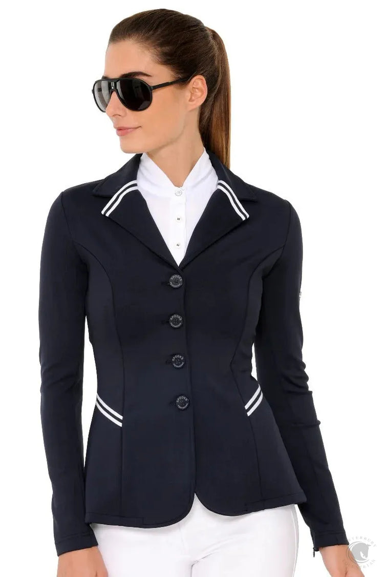 Slim fitting Show jacket with contrasting white stripes on the collar. A neat fit featuring many small details including SPOOKS-buttons with crowns and zippers on the sleeves - to make this show jacket special. In addition the functional jacket has zippers under the arms to open. This offers a high breathability.