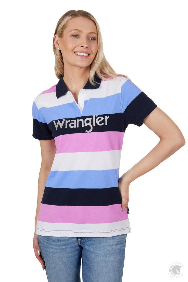 Classic polo shape, multi-colour stripe design, rib collar and sleeve cuffs, premium quality herringbone taping on front placket, contrast herringbone taping on inner neck and side seam splits, Wrangler® logo pip on side seam