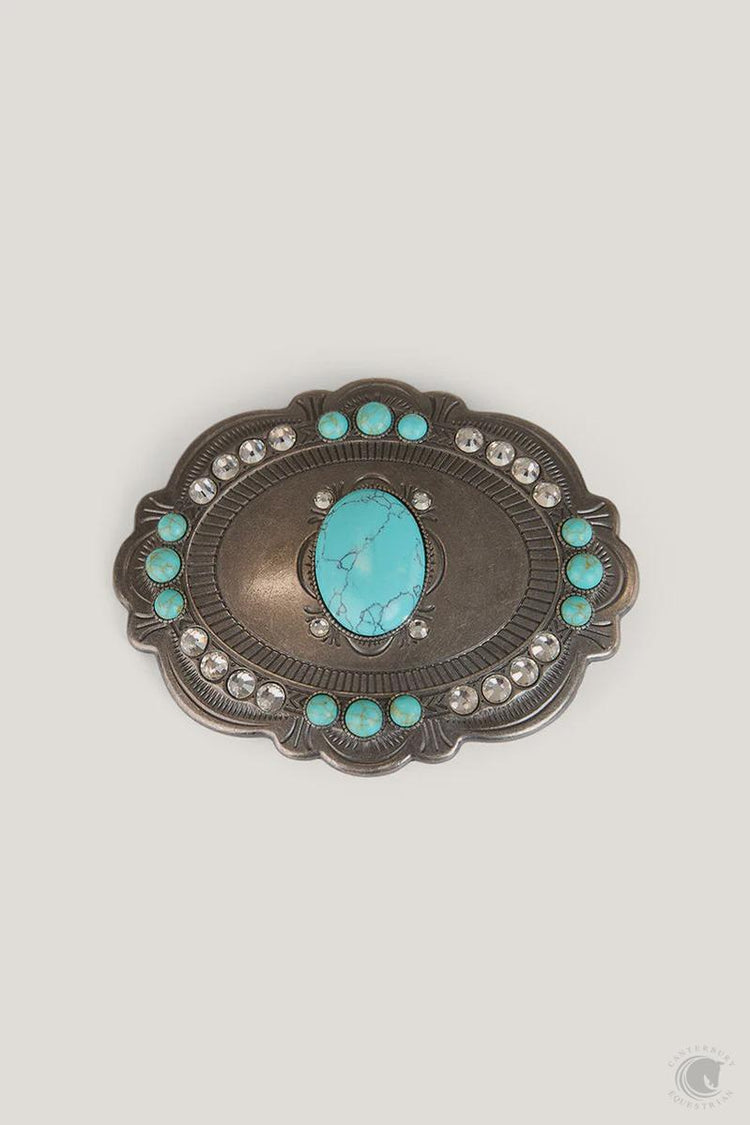 Small and large decorative stones adorn an ornate antique silver coloured belt buckle, making this little number scream western glamour.