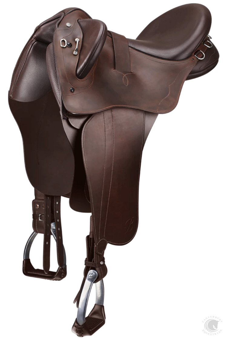 Leading technology offers unsurpassed fit, comfort, and performance for what you demand in a stock saddle for your horse. Ideal for trail riding, breaking, or working on your station. The Bates Kimberley provides instantaneous comfort for you in the saddle all day with poley knee pads, a traditional stock stirrup bar, long double girth points and a swinging fender that moulds to your leg and moves with you and your horse.