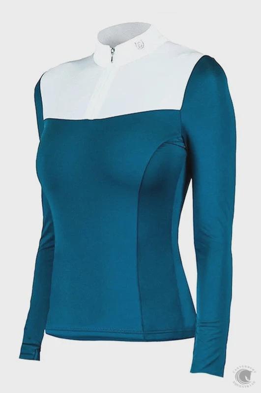 The Light Breeze Top is designed in a beautiful blue and white colour with white details. The top is crafted in a breathable, light weight, recycled polyester blend where the sides, the back of the shoulders, and sleeves are entirely in mesh material. This top feels like a second skin under the competition jacket. Wear it with our competition jacket from the Blue Meadow collection for a complete look.
