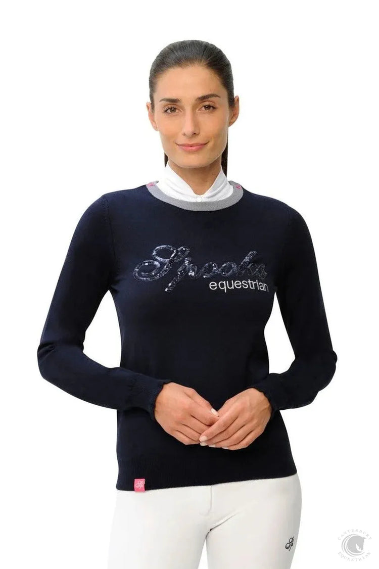 Light and knit sweater with a contrasting round neckline and SPOOKS logo made of sequins on the front. Small details like the ruffles on the cuffs make this pullover special.