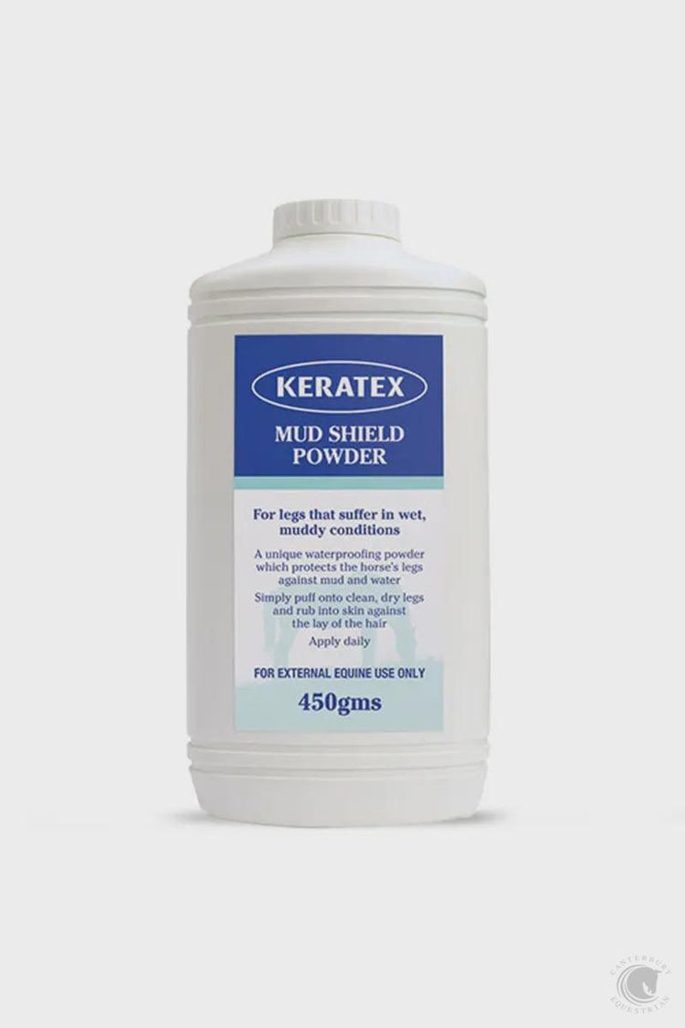 Keratex Mud Shield Powder is available in a 450gm plastic talc bottle.