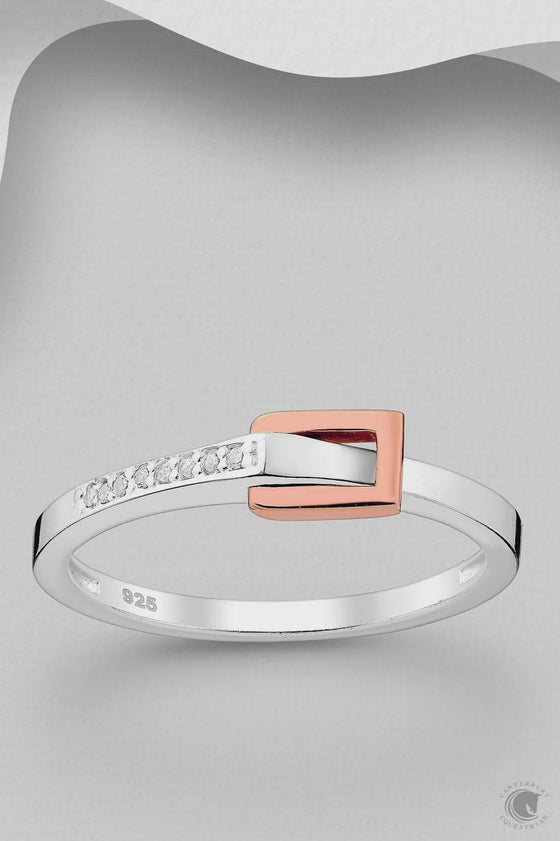 SILVER BELT RING, BUCKLE PLATED WITH 1 MICRON PINK GOLD, DECORATED WITH CZ SIMULATED DIAMONDS