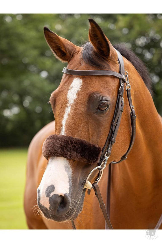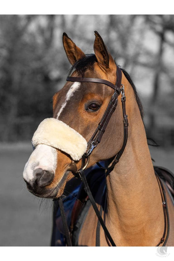 This super soft high-density faux lambswool noseband cover is a stylish and practical addition to your bridle. It reduces pressure and protects the horse's nose from rubbing, especially when wearing a tight noseband.