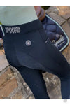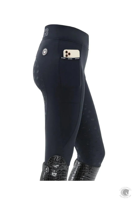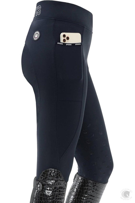 Lightweight riding leggins with mobile phone pocket on the right leg. The Filiz Full Grip Leggins convinces with a pleasant wearing comfort. The wide waistband provides a comfortable fit over the hips and optimal freedom of movement. The lightweight fabric of the leggins is super soft against the skin. The embroidered, striking SPOOKS writing on the waistband as well as the SPOOKS edging on the mobile phone pocket make up the sporty design of the leggins. The grip of the riding leggins is provided with small SPOOKS crowns and ensures optimum grip in the saddle. The usable front pocket on the left side offers space for your most important small items in addition to the mobile phone pocket.
