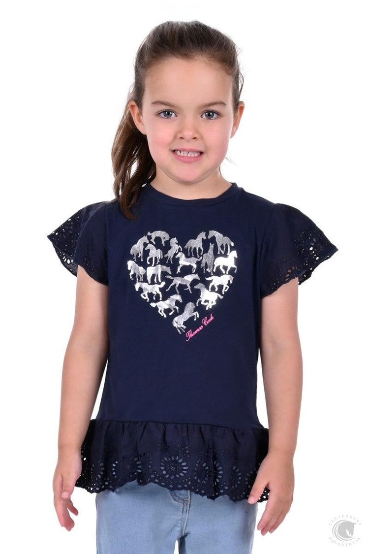 Flutter short sleeve tee, large front feature foil print, Thomas Cook logo internal bind, floral internal trim, broderie anglais flutter sleeves and hem frill