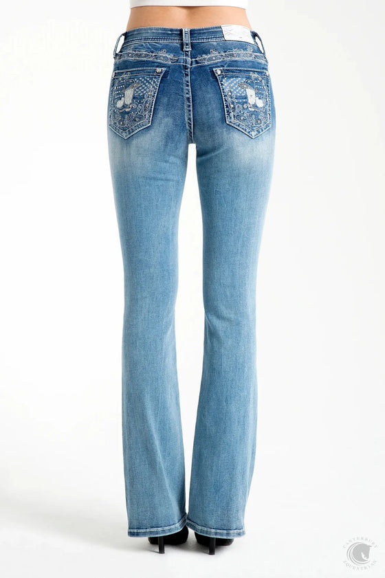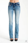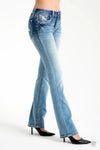 The Grace in LA women's mid rise bootcut jean in Easy Fit shows off your best shape by featuring a higher rise. The denim fabric features a softer and higher stretch for exceptional comfort all while maintaining a denim look. The mid-rise creates a form-flattering fit for every curve. The jean is detailed with a hat /boot embellished and embroidered design on the  back pockets, added embellishment on the front pockets, natural hand-sanding, and whiskering. They look like they’ve been yours forever.