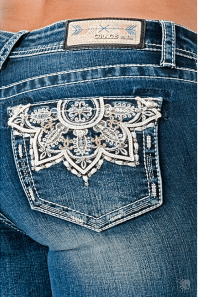 The Grace in LA women's skinny jean in Easy Fit shows off your best shape by featuring a higher rise. The mid-rise creates a form-flattering fit for every curve. The jean is detailed with an aztec /feather details, natural hand-sanding, whiskering to create a vintage look. The denim fabric has the perfect amount of stretch and great holding power.