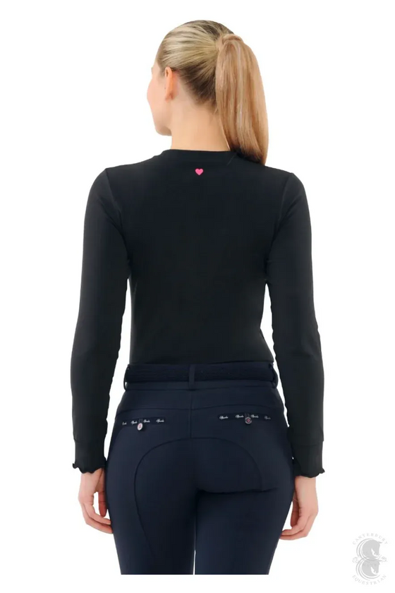 Figure-hugging longsleeve shirt with round neck. The shirt is characterized by the sweet ruffles on the cuffs. The simple, elegant look of the shirt is rounded off by the discreet glittering SPOOKS writing on the left chest and the small heart on the neck. A true combination talent - whether in winter under a nice sweat jacket or individually on cool summer days. With the Lianna Longsleeve Shirt you have a partner for the whole year.