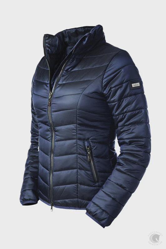 Elegant navy blue jacket with chrome details to wear all year round. Stylish Equestrian Stockholm embroidery on the back. Lightweight and warm, made with water repellent fabric and recycled filling. The filling contains coffee grounds which works as an odor control. This function keeps your jacket fresh for longer, which could mean fewer washes. This means less wear on the jacket as well as the planet.