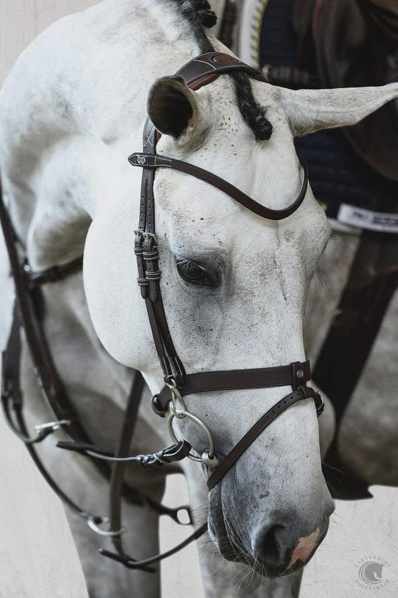 A stripped high function-bridle with a flat, simple noseband that has a completely removable flash strap discretely decorated with a PS badge. The hooks of which the bit attaches to have a transparent rubber cover in order to minimize the rattling that may occur between the metal. This is the perfect bridle for riders who often changes the bit since the simplicity of the hooks makes the bit-changing process very simple and efficient.