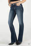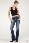 - Mid-rise, dark-wash bootcut jeans