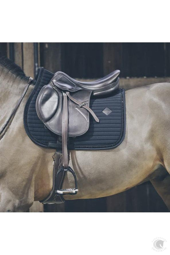 Our Saddle Pad Pearls is shaped for jumping and provides excellent cushioning between the horse’s back and the saddle while protecting against friction. This saddle pad has a unique horizontal quilting and is made out of a breathable material (43% Nylon, 43% Polyester and 14% Spandex). The stunning piping made out of pearls is a real eye-catcher! This saddle pad in combination with one of our Fly Veils Stone & Pearl (Long or Wellington) or Fly Veil Wellington Glitter Band is just drop-dead-gorgeous! The saddle pad has no annoying straps to attach to the saddle, only a nylon strap for the girth. It features a subtle leather logo in the same color as the saddle pad, whilst still offering enough room to embroider it if needed. The saddle pad is machine washable at 30°, no dryer. We advise you to use a washing bag to avoid the pearls from damaging.