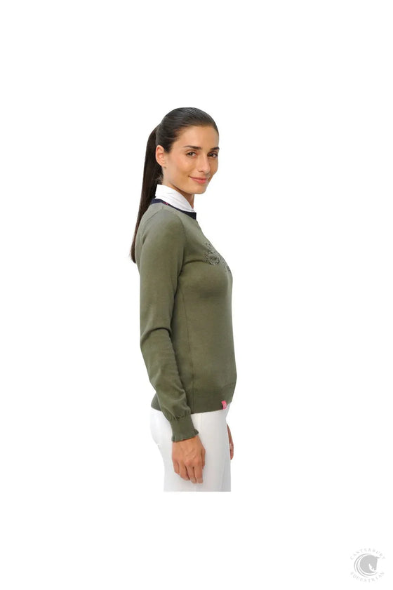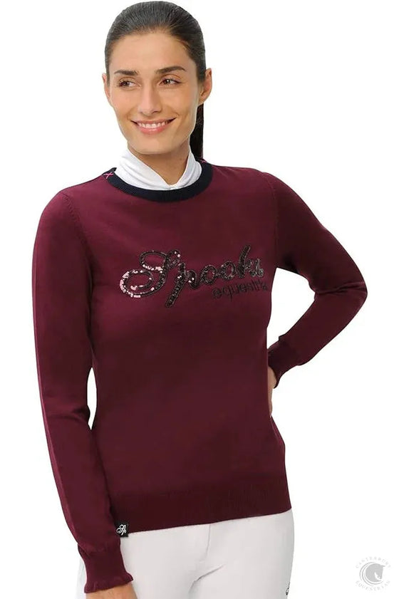 Light and knit sweater with a contrasting round neckline and SPOOKS logo made of sequins on the front. Small details like the ruffles on the cuffs make this pullover special.