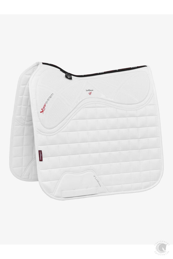 The X-Grip Dressage square combines the stylish, iconic LeMieux cut with the new X-Grip silicone design to ensure saddle stability and grip. The Memory Foam under the saddle area aids with comfort and shock absorbency. The unique blast foam core has been through a process where hot air is forced through the memory foam under pressure to create the extremely breathable yet supportive and lightweight perforated material.   Designed to fit a wide range of dressage saddles with its cut back high wither & signature girth protection area, with multiple girthing options. The luxurious suede top side is complimented by a new super soft Bamboo lining to absorb & control sweat under the saddle and are beautifully comfortable and secure - minimising friction.